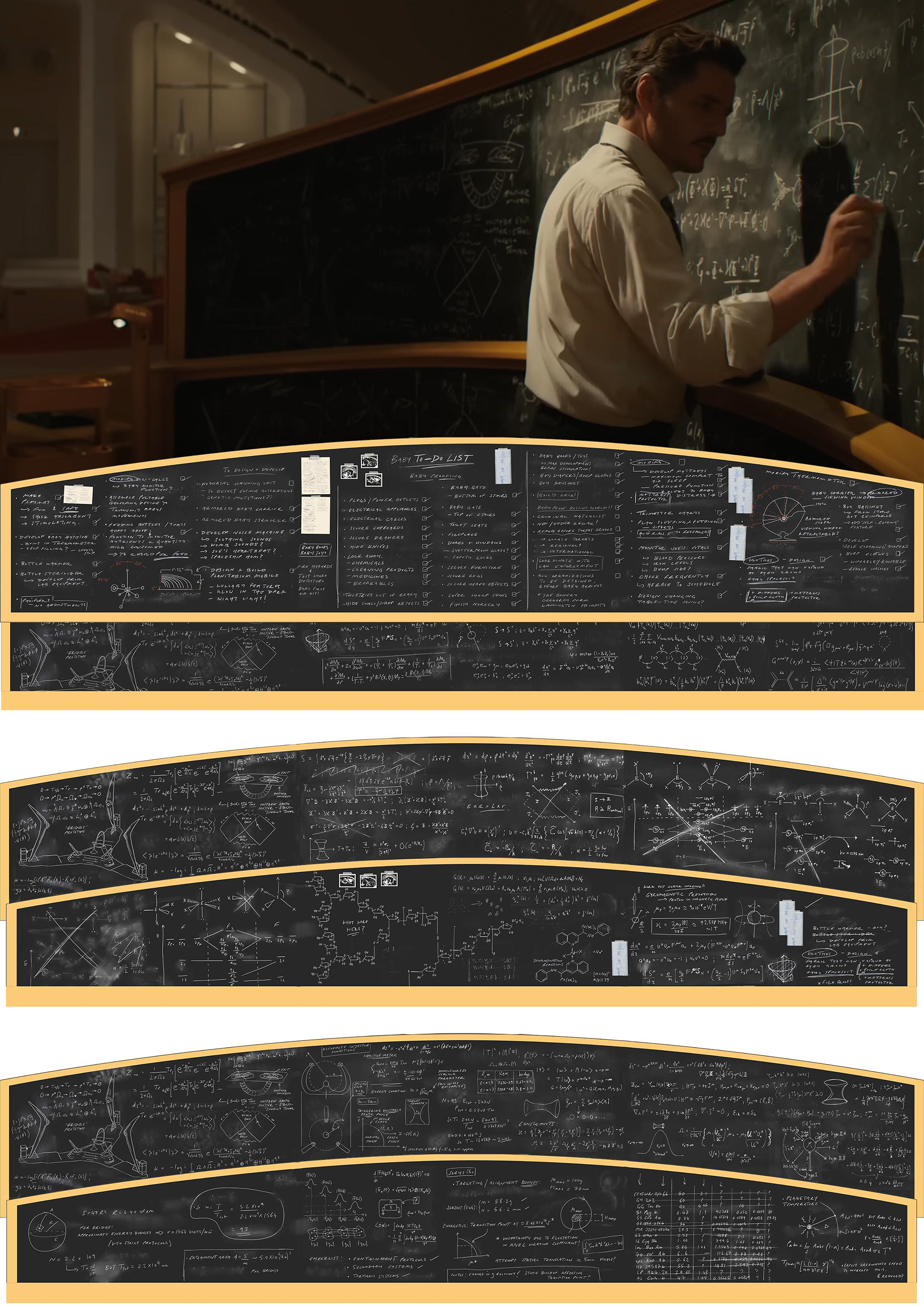 Planning the many changing segments of Reed's chalkboard. Physics content provided by theoretical physicists Dr. Clifford Johnson and Dr. Subodh Patil.